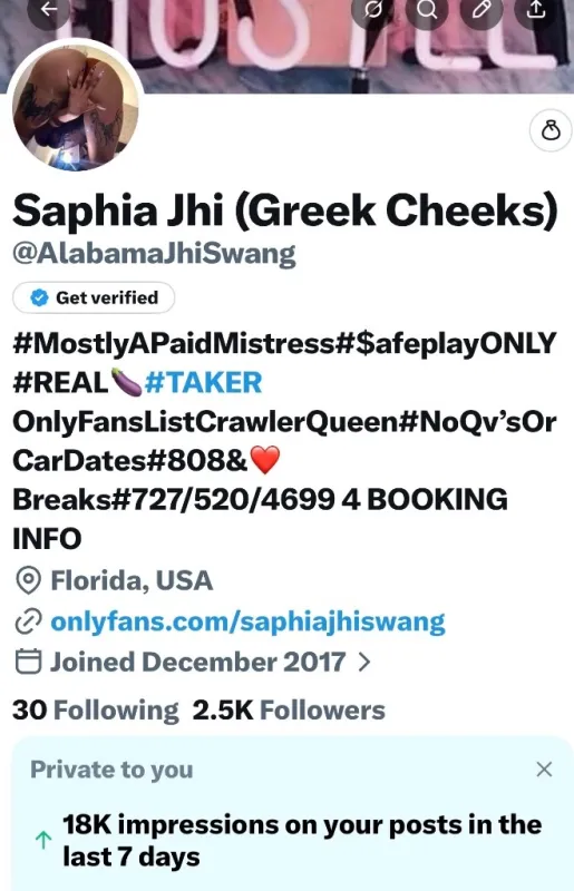 ๐ฃ 180 $pecials!! I โค ANAL ( XXXContent) Extreme, dirty, talk!! My OF/Twitter videos RRR RATED!! Subcribe 2 Only fans!!!! Anal Master 420 lover - Follow My ONLYFANS 4 ALL MY ANAL DEMON ADVENTURES!!! My Instagram/TwiiterX - TWITTER"@AlabamaJhiSwang" Greek Cheeks!! Pictures are ๐ฏ ME!! Nude Mutual facetime starting rate 50 ๐น REAL and Verifiable!! 5'2 /155 lbs 34inch Waistโฃ42Inch hipsโค36 cup ๐ Private Upscale St. Pete Home 6 hr blocks offered at 1500 W-BACKDOOR INCALL Only) FULL 24 hr OVERNIGHT 3000... ๐น๐น๐น..๐ Will consider travel to "private home" STARTING Donations 500 ๐ธ ๐ธ Multiple Hours Only!! Light screening ๐ง Required Body rubs offered as well Mon-Wed. 120/OR 200 (prostate) PS. LOVE getting dressed up for WELL Compensated Public companionship"/"casino"/"airport"/"convention" Dates etc!! ๐น50 FaceTime $essions!! W/Race play 100 WARNING!! Erotic Xxx (EXTREMELY XXX EXPLICIT) ๐๐๐ /INSTAGRAM- msgreekcheeks๐ฅ๐ฅ TWITTER (AlabamaJhiSwang) "FRIENDLY" 420 (FOR ENTERTAINMENT PURPOSES ONLY NO PARTICULAR SERVICES GUARANTEED... "DONATIONS ARE FOR OUR ADULT EXPERIENCES" -"Pretty Woman Package" 2 ๐๐ 3 ๐๐๐ Starting At 5,000 ๐น(Varies on Location ETC) ๐๐๐๐ขโต๐ธโ๐ฟ๐ฟ๐ฐ๐ โฑ๐พ๐งณ๐บ