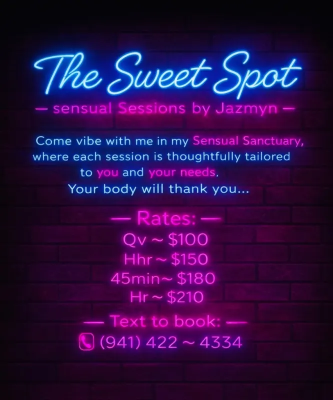 ✨ THE SWEET SPOT ✨ Sensual Sessions by Jazmyn Come vibe with me in my private Sensual Sanctuary—a warm, inviting space where stress melts, energy softens, and your body finally gets what it’s been craving… 😌💫 This is not a rushed experience. Each session is intuitively tailored to YOU, your mood, your tension, your energy. From the moment you arrive, you’ll feel the difference— soft lighting, soothing scents, slow sensual music, and an undeniable calming vibe that wraps around you. 💆🏽♀ What to Expect: ✨ Unmatched hands ✨ Deep relaxation & connection ✨ A safe, clean, discreet environment ✨ Attentive, nurturing energy ✨ A session your body will thank you for… 🔥 Whether you need to unwind, escape, or simply be fully present in the moment— this is your sweet spot. ⏳ Rates: • Quick Vibe – $100 • Half Hour – $150 • 45 Minutes – $180 • Full Hour – Ask Me 💌 📍 Private & Safe Location 🚿 Fresh linens • Clean space • Respectful energy only 💋 Serious inquiries only. Good vibes. Mutual respect. Come relaxed—leave blissed out. ✨ Once you find The Sweet Spot… you’ll keep coming back. ✨
